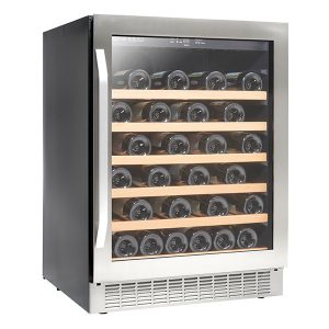 מדפי העץ הנשלפים מקנים למקרר היין מימד נוסף של יופי ויוקרה.