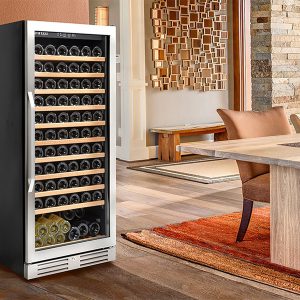 מדפי העץ הנשלפים מקנים למקרר היין מימד נוסף של יופי ויוקרה.
